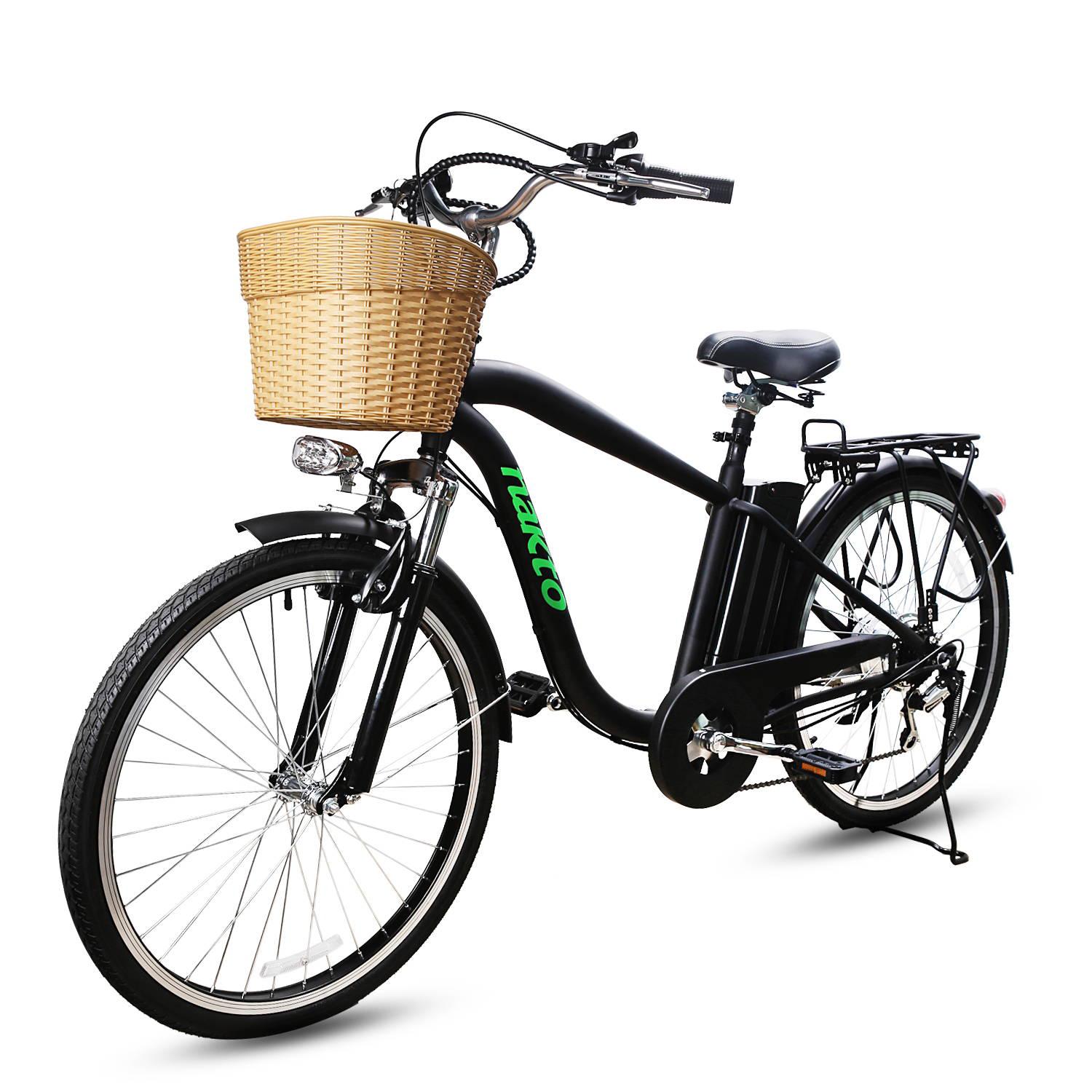 Driven by a 350W rear-hub motor with both throttle and cadence-based pedal assist, features a 36v 10a lithium battery and easy-to-use controls 6-speed Shimano derailleur, 14-18 tooth cassette with a 44 tooth chainring in the front, V brake in the front and drum brake in the rea